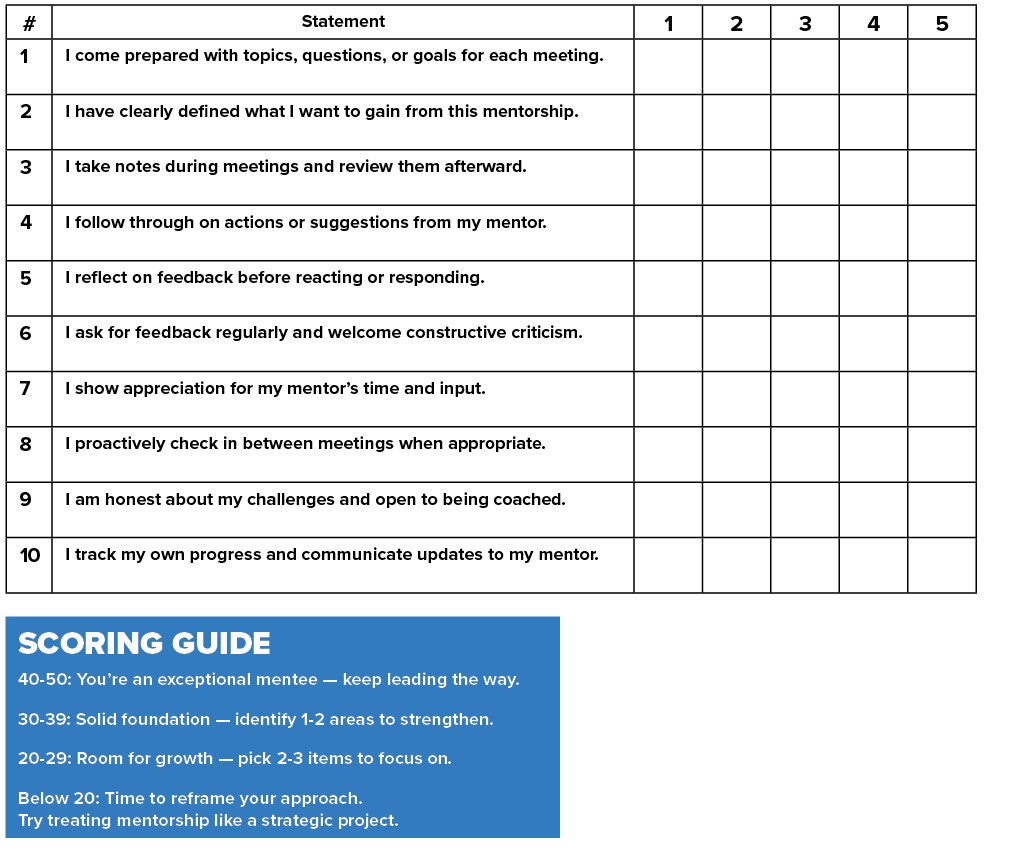 Use this tool to evaluate how effectively you’re showing up as a mentee. The stronger your engagement, the more value you’ll gain from your mentorship. Rate each item from 1 (Rarely) to 5 (Always):