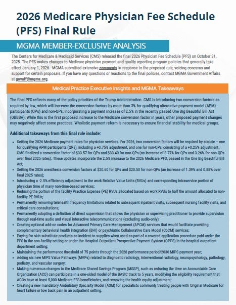 Many of these policies are scheduled to take effect in 2026, and practices should prepare for operational and financial adjustments accordingly. Stay tuned for additional resources from MGMA about how the finalized policies will impact your practice.