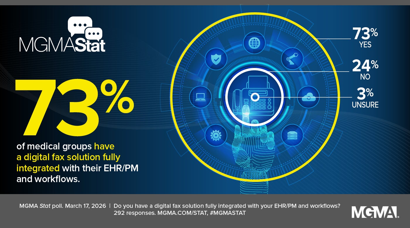 Our March 17, 2026, MGMA Stat poll finds that nearly 1 medical practice in 4 (24%) report not having a digital fax solution fully integrated with their EHR/PM and workflows, while 73% do, and 3% were unsure. The poll had 292 applicable responses.