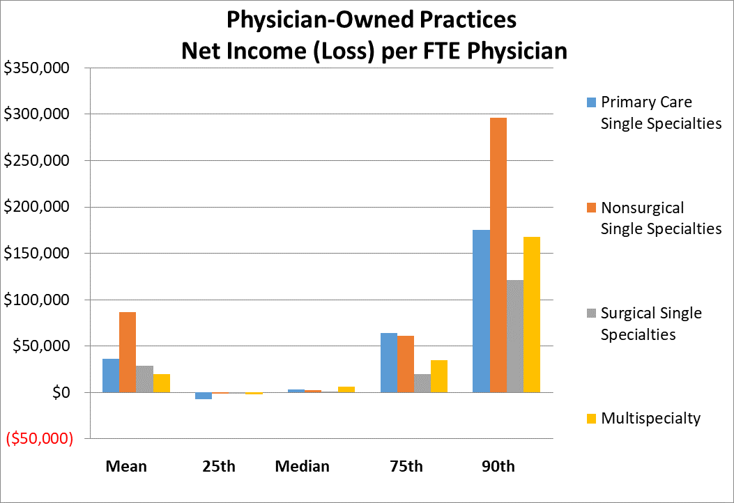 The median for physician-owned practices indicates they essentially break even, while the top 10% of practices showed substantial profits, ranging from about $121,000 to nearly $300,000. Again, this same pattern has been observed in prior years: Physician-owned practices usually break even or make a profit.