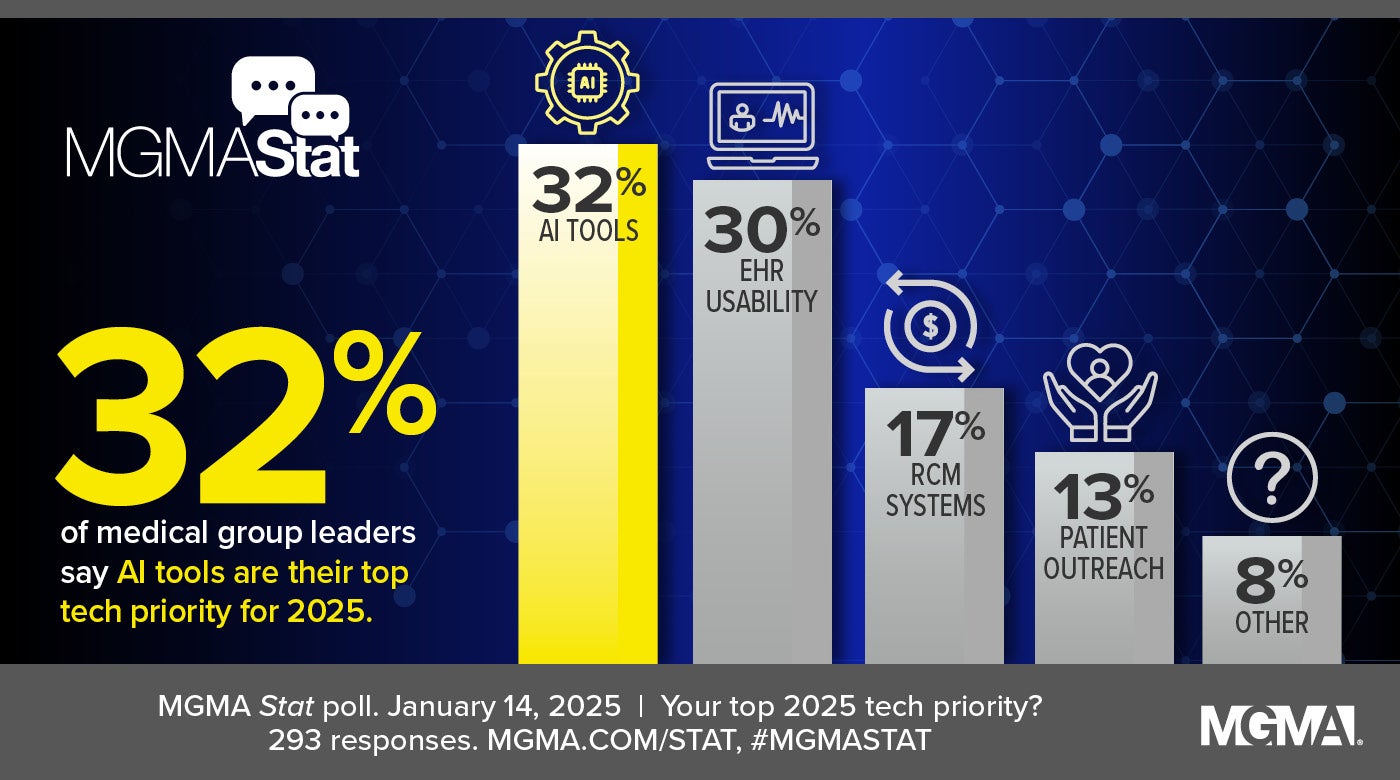 A Jan. 14, 2025, MGMA Stat poll found that AI tools (32%) were the top tech priority for 2025, ahead of EHR usability (30%), revenue cycle management (RCM) systems (17%), patient outreach technology (13%), and “other” (8%). The poll had 293 applicable responses.
