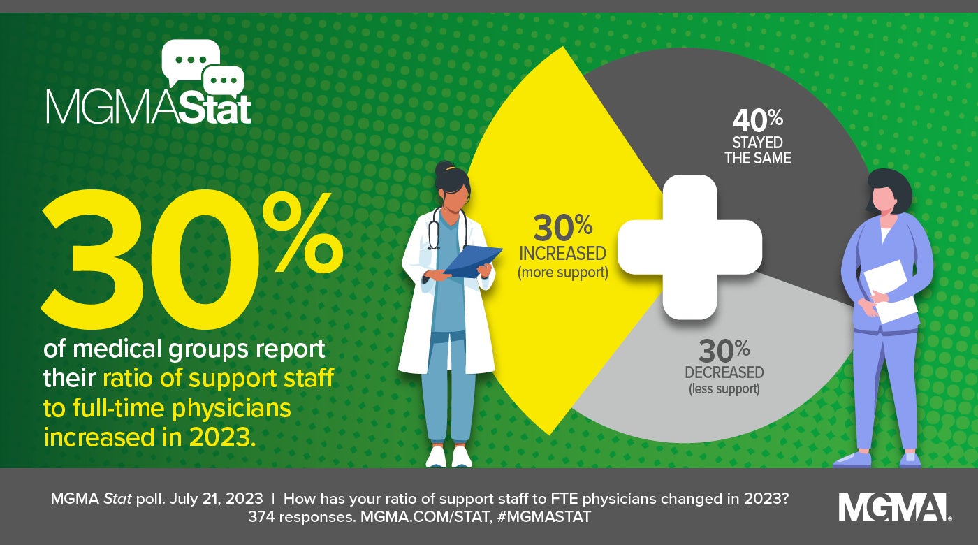 A July 21, 2023, MGMA Stat poll asked healthcare leaders how their practices’ ratio of support staff to full-time-equivalent (FTE) physicians has changed in 2023. Only 30% reported an increase in support staff, while 70% told MGMA that their levels of support staff per doctor stayed the same (40%) or decreased (30%) so far this year. The poll had 374 applicable responses.
